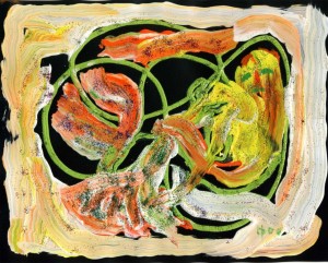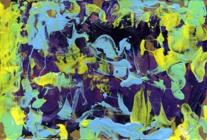 Egy mélyből (sötét lila alapszín) kitörő lávaszerűség ( világoskék, zöldes sárga) ami friss “anyagot” jelképez, mely miután lehűl színt változtat és megszilárdul.